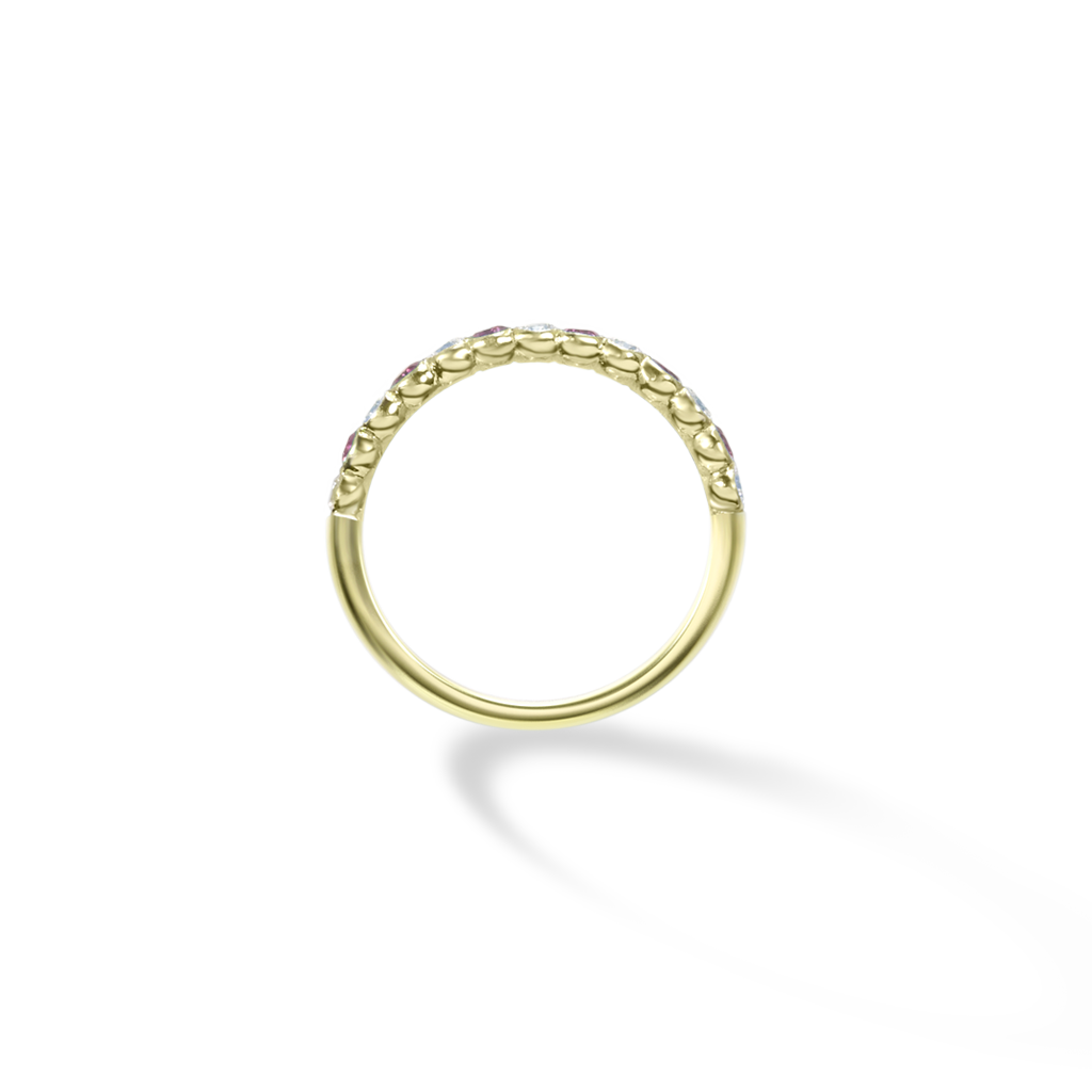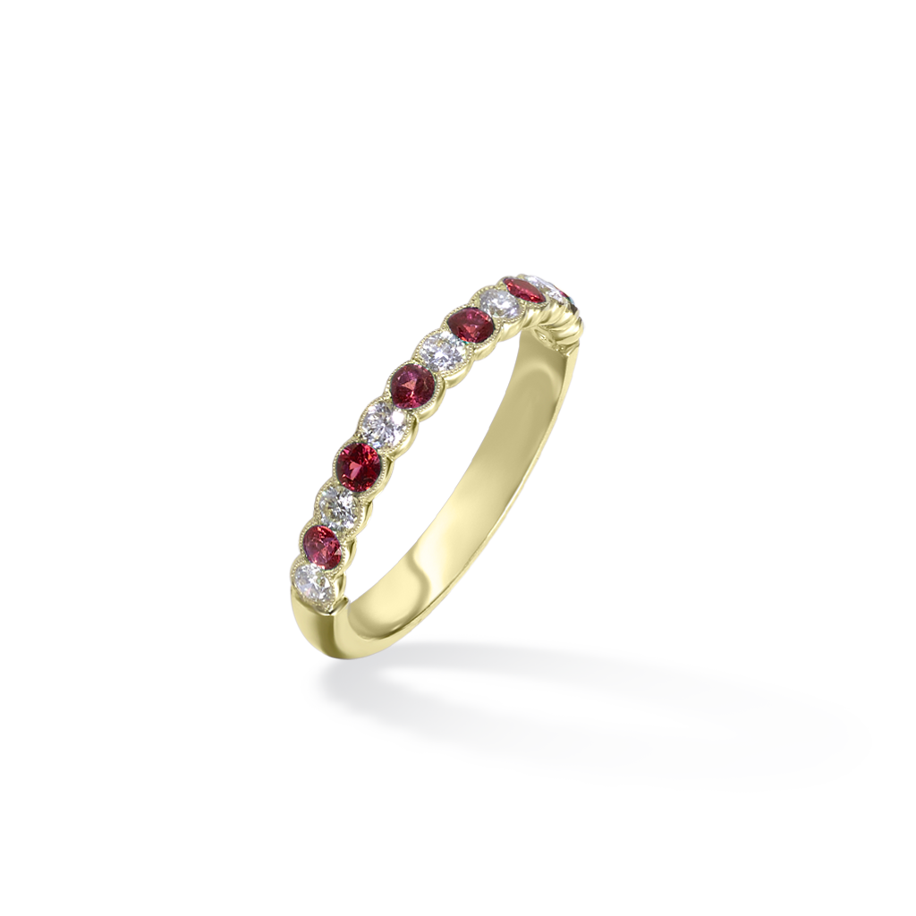 A rubover set ruby and diamond half eternity ring mounted in 18ct yellow gold. The rubies are exceptionally bright and lively making this slim band pack a significant punch, a perfect ring to stand alone or as part of a stack
