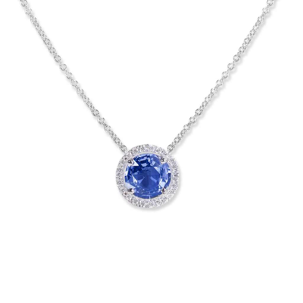 A round sapphire and diamond cluster pendant mounted in 18ct white gold from the Phoebe collection with a 1.1ct sapphire and approx 0.20ct round brilliant diamonds