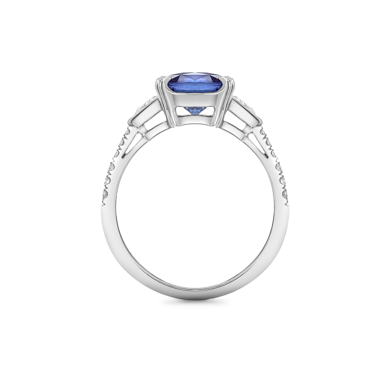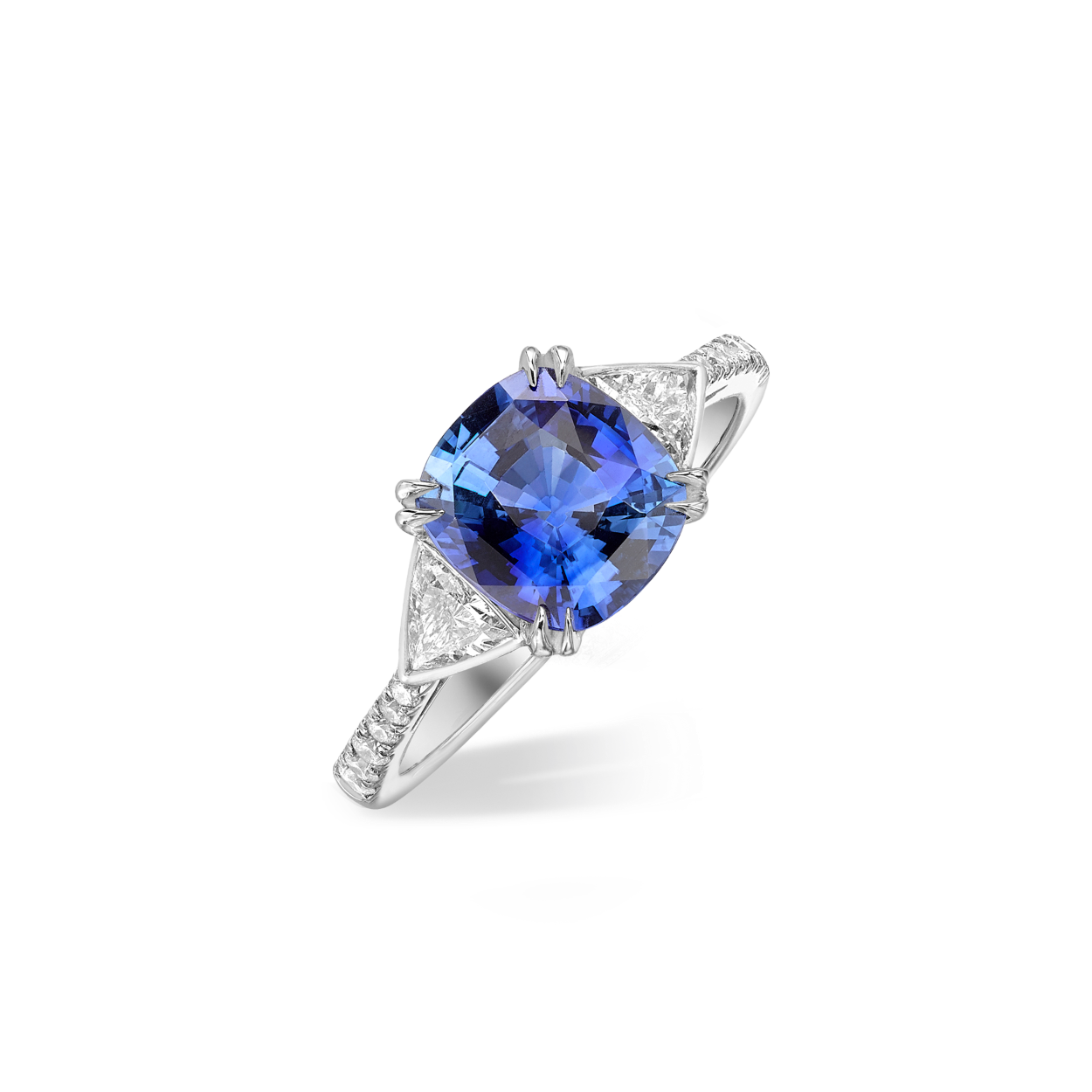 Clean lines! A stunning cushion cut Ceylon sapphire mounted with double talon claws and rubover set trillion diamonds accented with microset diamonds on the shank.