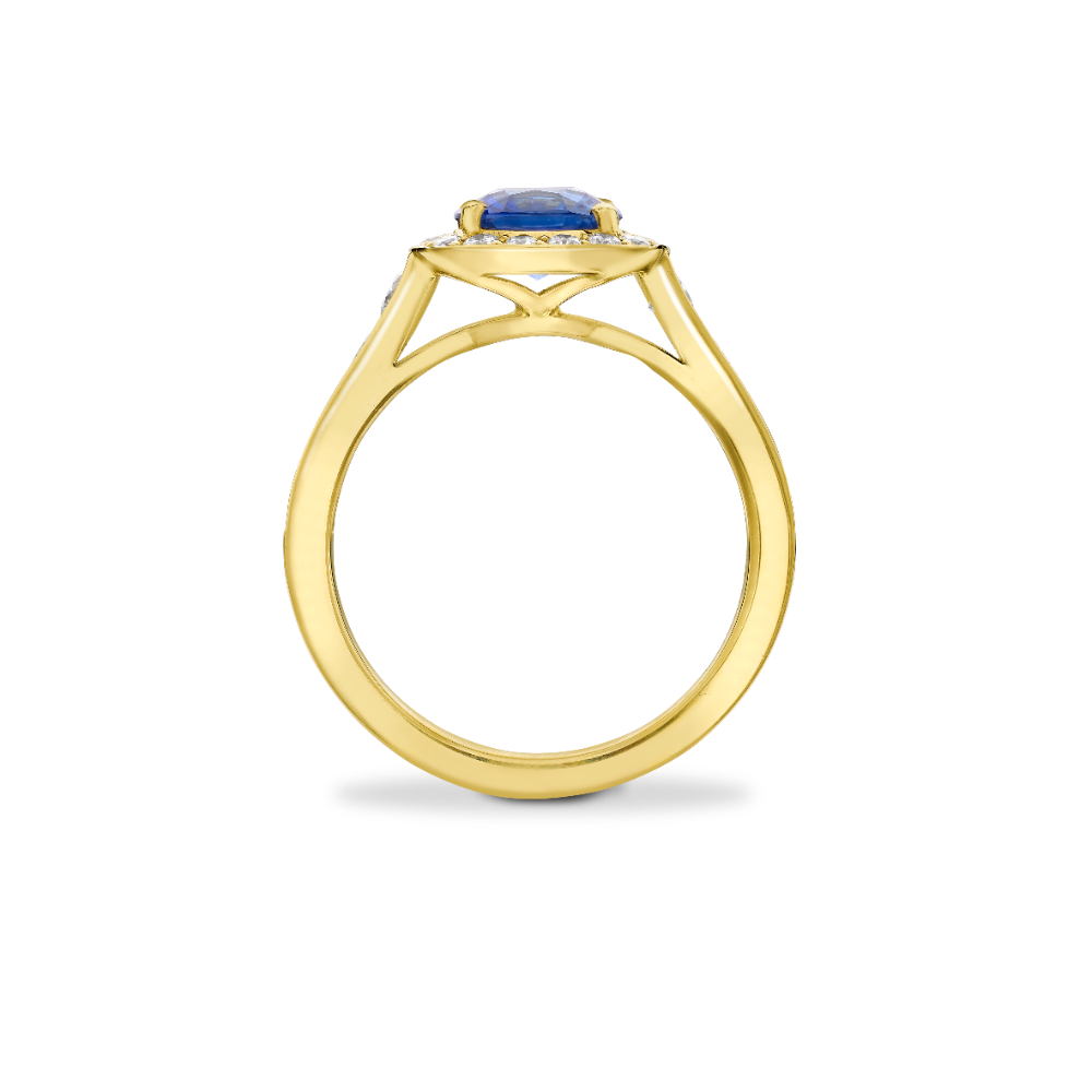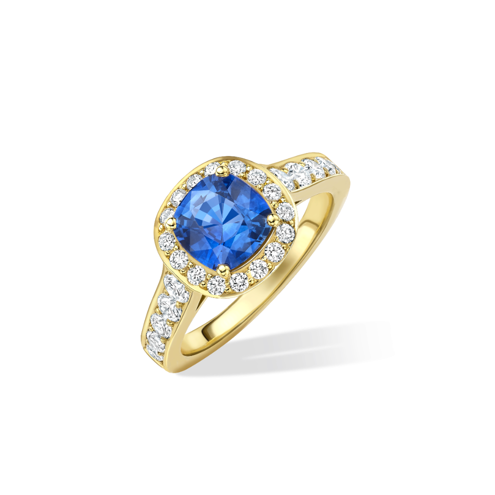 We love a sapphire at Bibelot and this cushion cut Ceylon sapphire is the perfect centre stone for this grain set diamond cluster ring mounted in 18ct yellow gold.