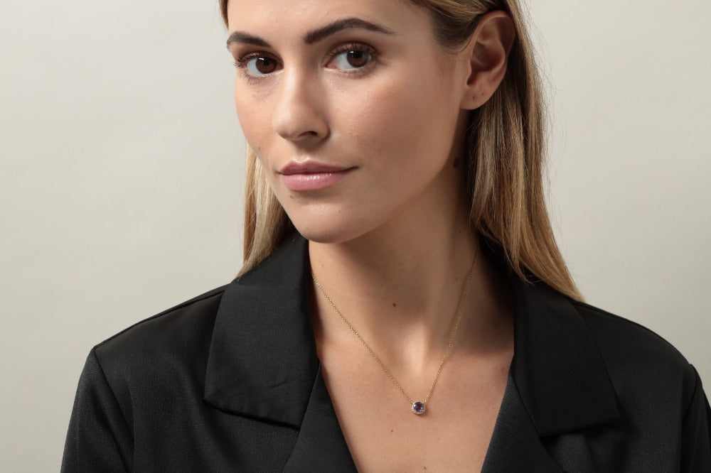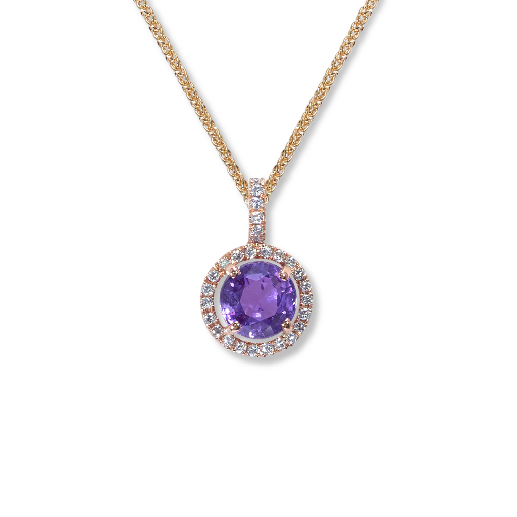 As ever its all about the colour and quality of the sapphire, this diamond cut round purple sapphire is a cracker, full of life and with a perfect saturation of colour. The purple of the sapphire is contrasted by the 18ct rose gold
