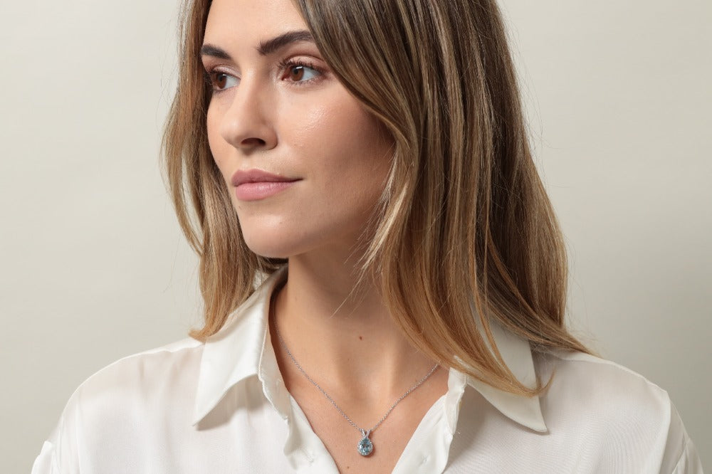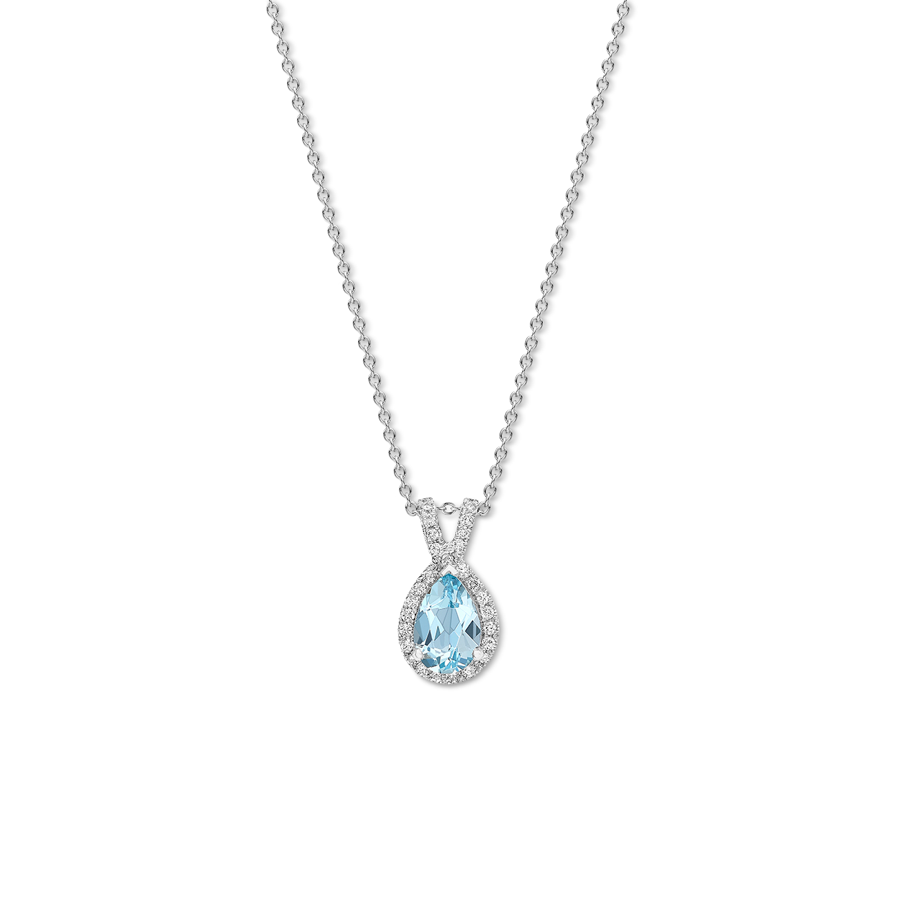 A fine drop shape aquamarine and diamond pendant with a double bale mounted in 18ct white gold. As with all Bibelot pieces this has been designed with everyday life in mind