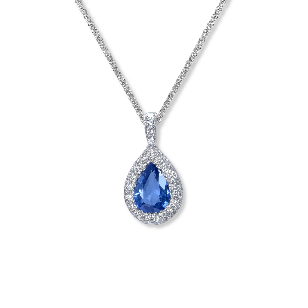 A drop shape Ceylon sapphire mounted with a delicately set pave diamond border and bale in 18ct white gold