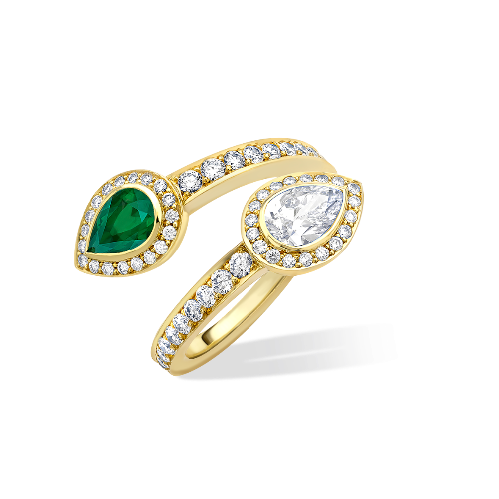 Marrying a fine Colombian Emerald and an exquisite pear shape diamond in rubover settings with grain set diamond set shank this crossover ring is a stunning ring which is full of life. The ring is mounted in 18ct yellow gold
