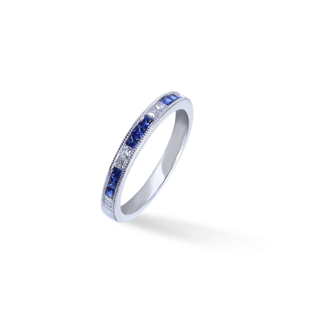 One of our stacking ring collection this Hisako channel set princess cut sapphire and diamond half eternity ring has colour and sparkle in abundance. Set low on the finger this ring will sit easily with as one of a stack of on its own. Celebrate those milestones in life with a splash of colour!