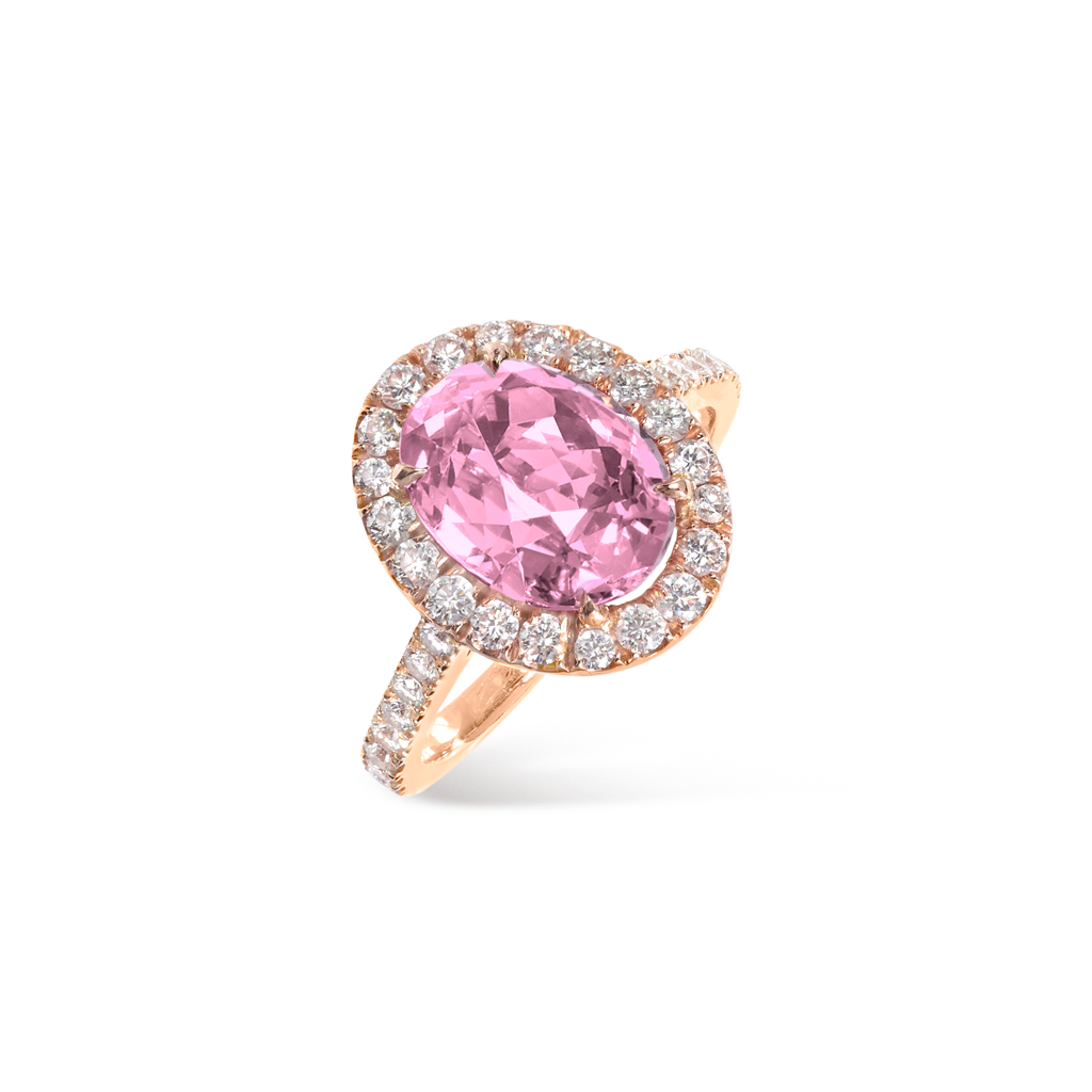 A beautiful pale pink oval sapphire and microset diamond cluster ring mounted in 18ct rose gold. The rose gold compliments the light pink hue of the sapphire, this is a contemporary classic style
