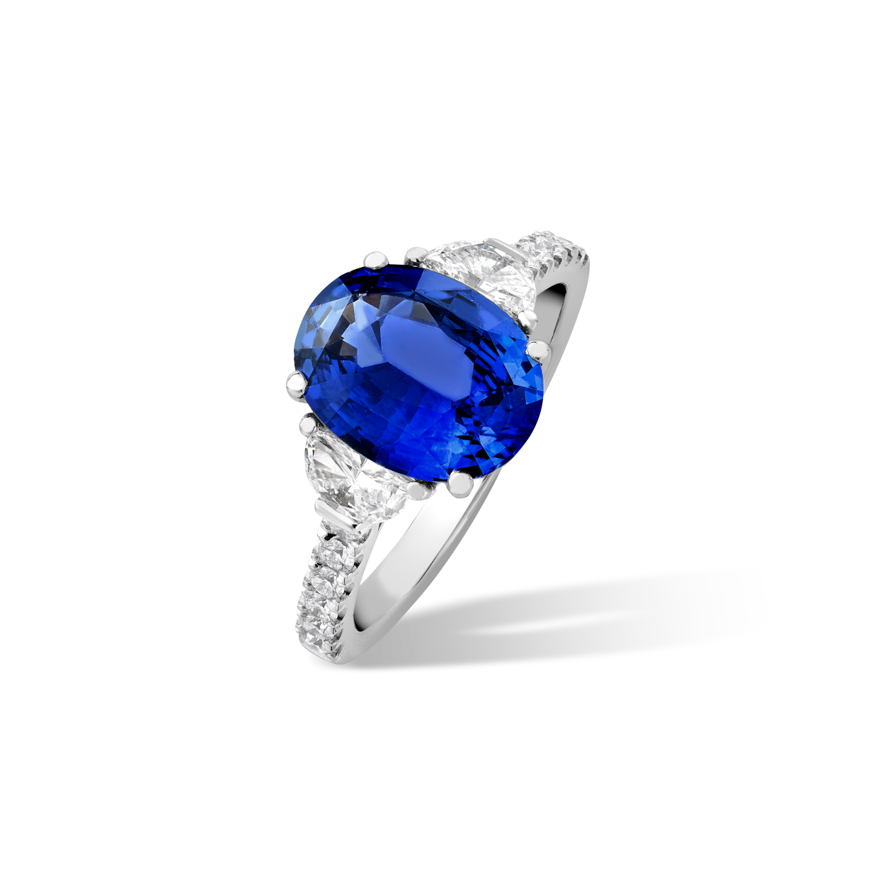 This royal blue Sri Lankan sapphire and half moon diamond three stone ring is a contemporary classic, double claws setting the sapphire with claw and bar settings on the half moons & microset diamond shank. The ring has been handmade in platinum in London