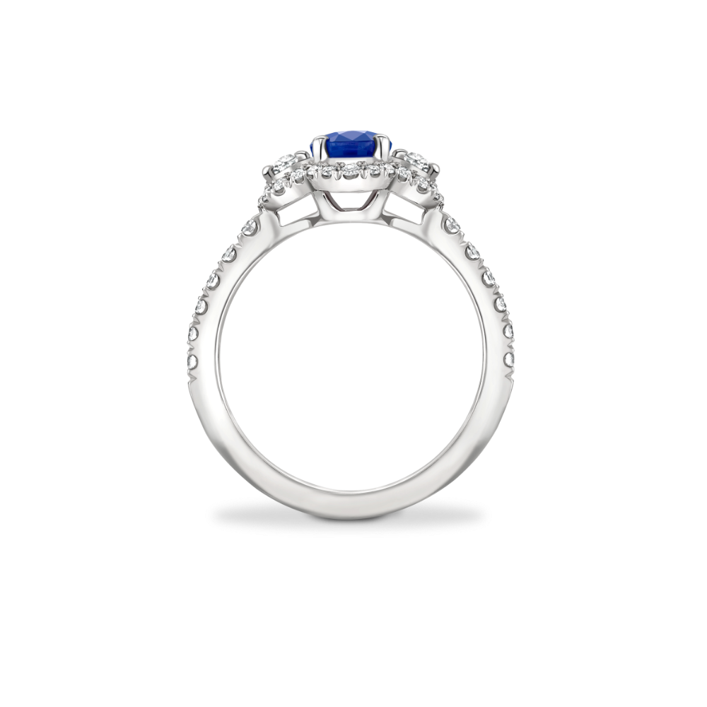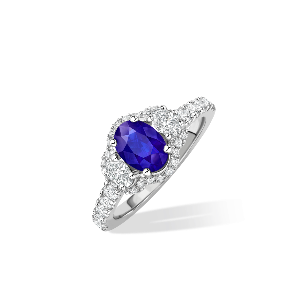 A variation on both a three stone and triple cluster ring, the central 1.1ct oval sapphire and matching pair of oval diamonds are surrounded by microset round brilliant diamonds in platinum.