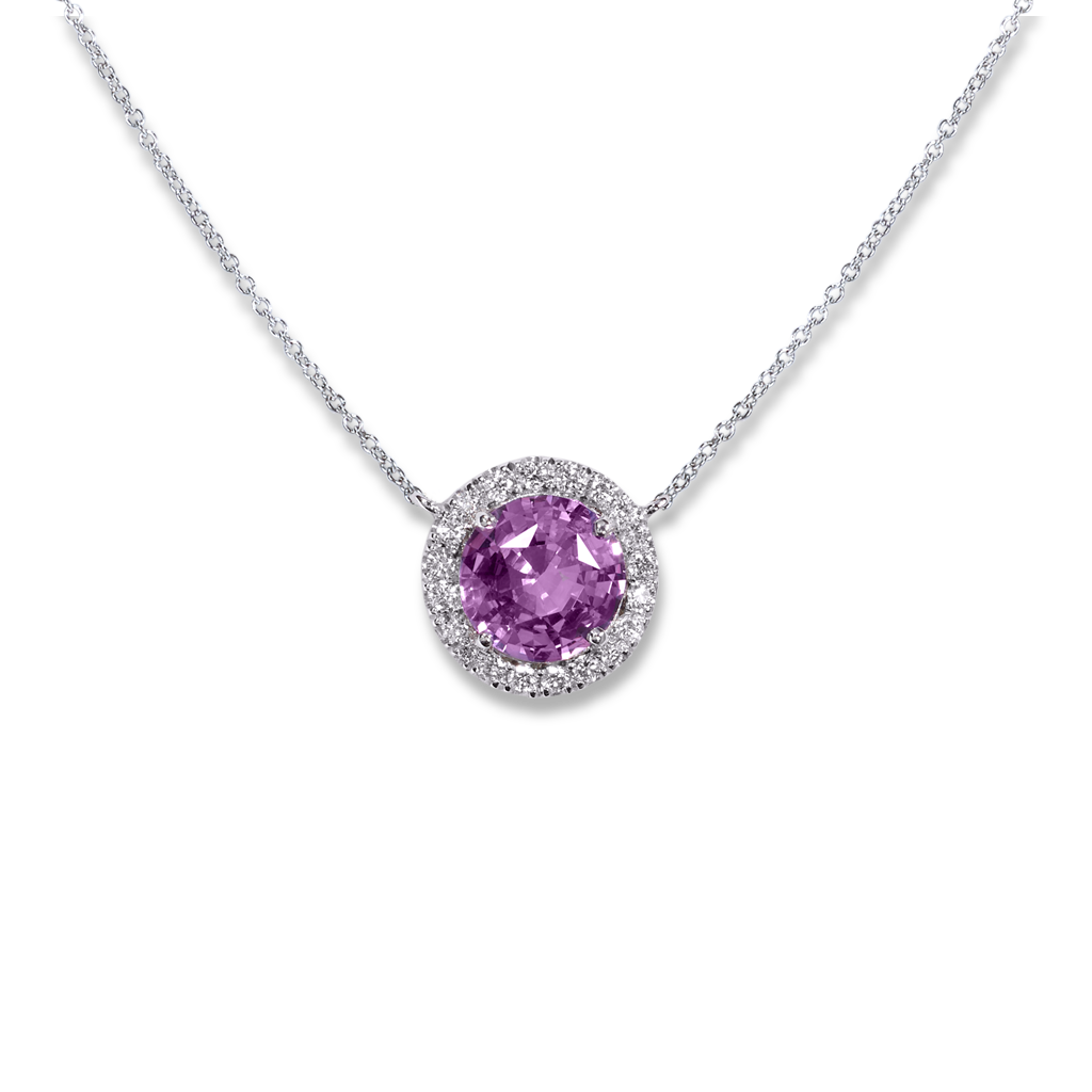 A round pink sapphire and diamond cluster pendant mounted in 18ct white gold from the Phoebe collection with a 1.4ct sapphire and approx 0.20ct round brilliant diamonds