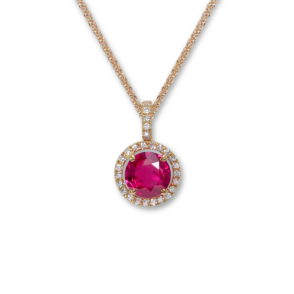 A deep rich red Spinel with a hint of pink as the centre for this Cynthia pendant. Designed as an everyday piece the fine diamond border really brings the Spinel to life