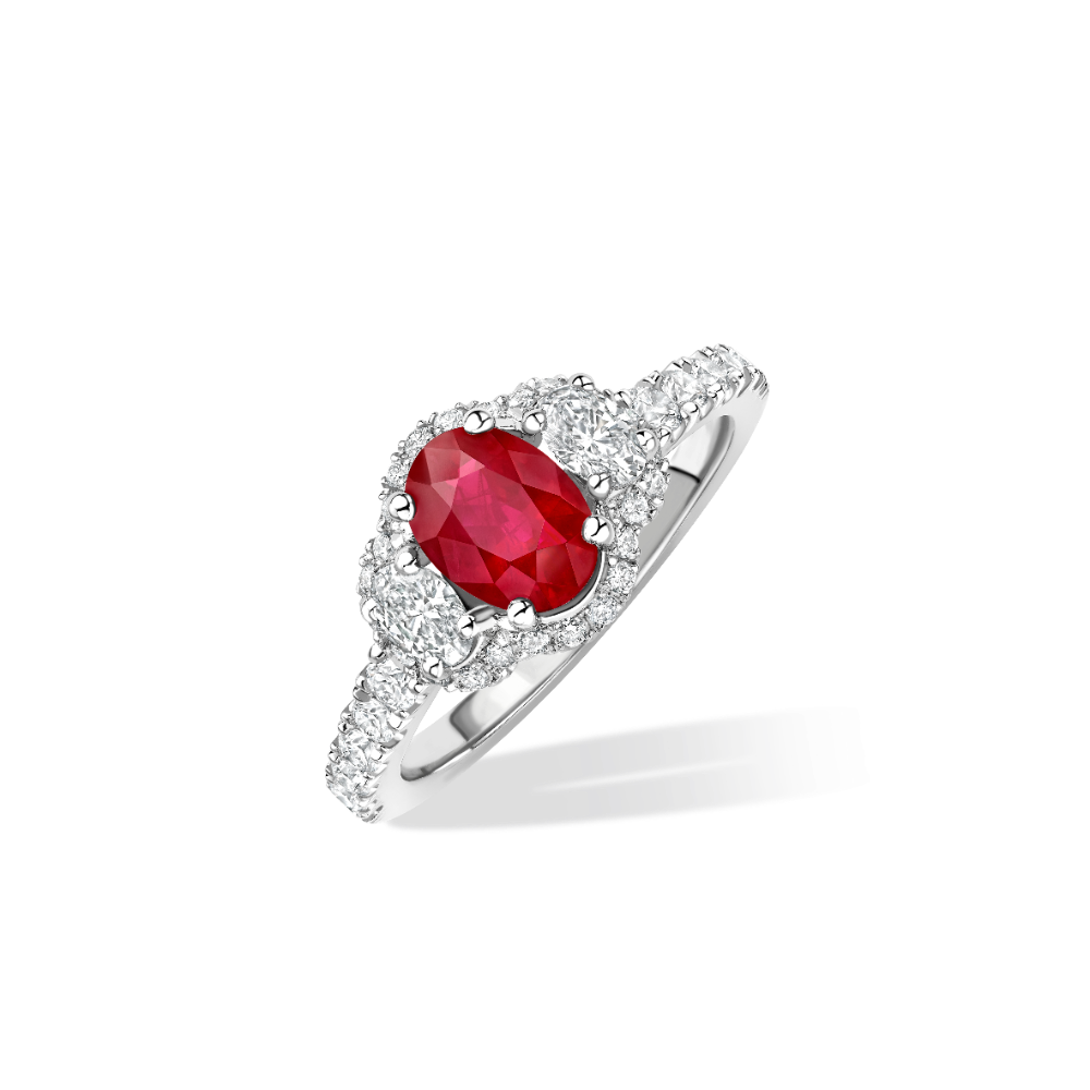 A variation on both a three stone and triple cluster ring, the central 1.2ct oval ruby and matching pair of oval diamonds are surrounded by microset round brilliant diamonds in platinum.