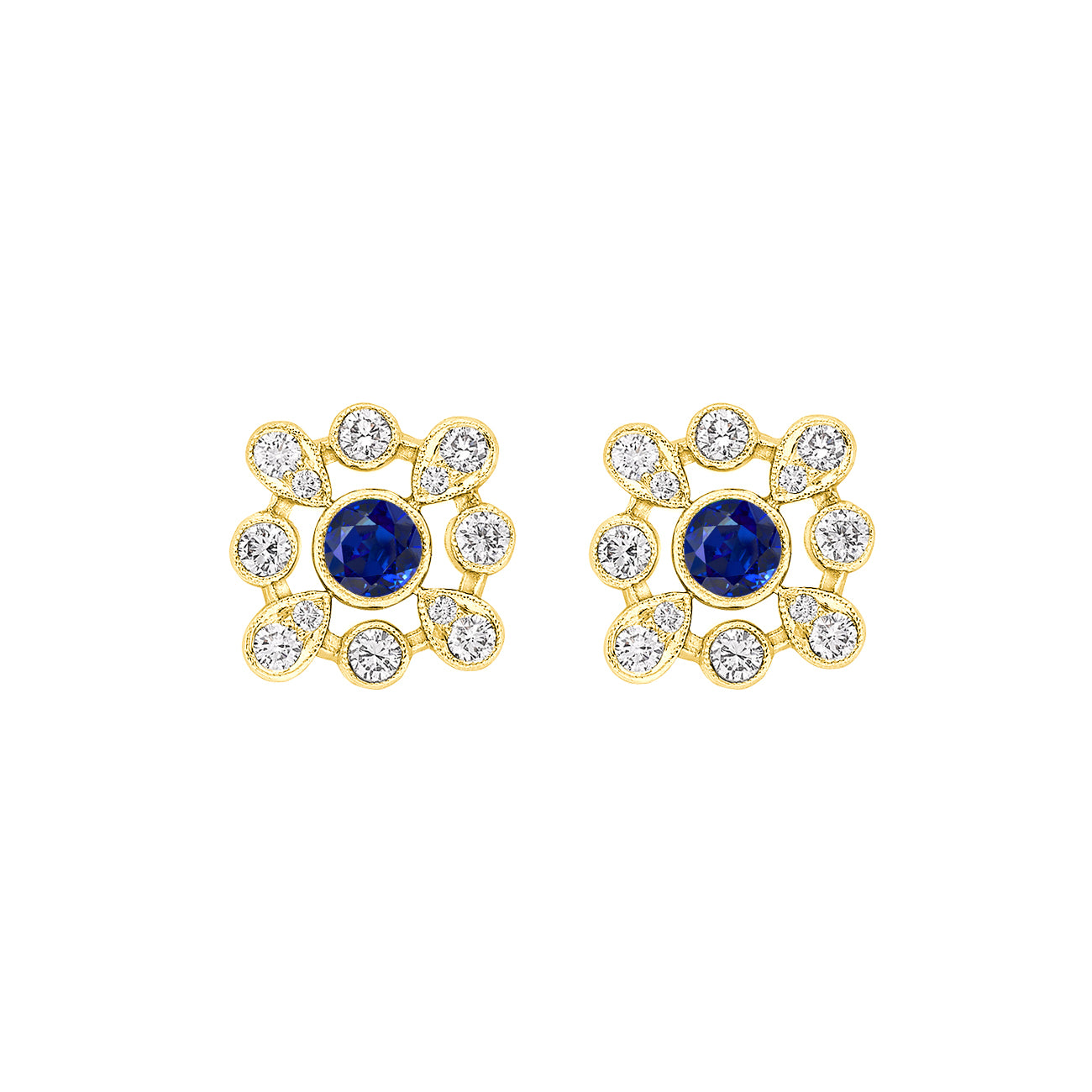 Bright blue sapphires mounted as the centre stones for these snowflake cluster earrings in 18ct yellow gold
