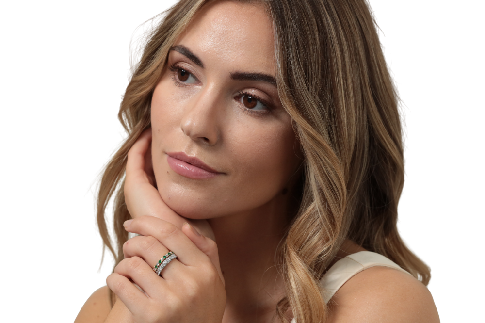 A castle set (castle simply referring to the way the stones are set when viewed from the side) emerald and diamond half eternity ring mounted in 18ct yellow gold. The fine band is 2.5mm wide which makes this a great stacking ring